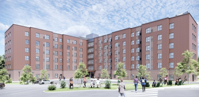 The seven-story building will feature a suite-style layout with three- and four-bedroom, six-student suites, along with single- and two-bedroom suites, ADA-compliant units, and a two-bedroom apartment for the resident director. The structure’s L-shape is designed to fit the campus’s natural slope, preserve existing trees, and create a welcoming entryway, officials said.