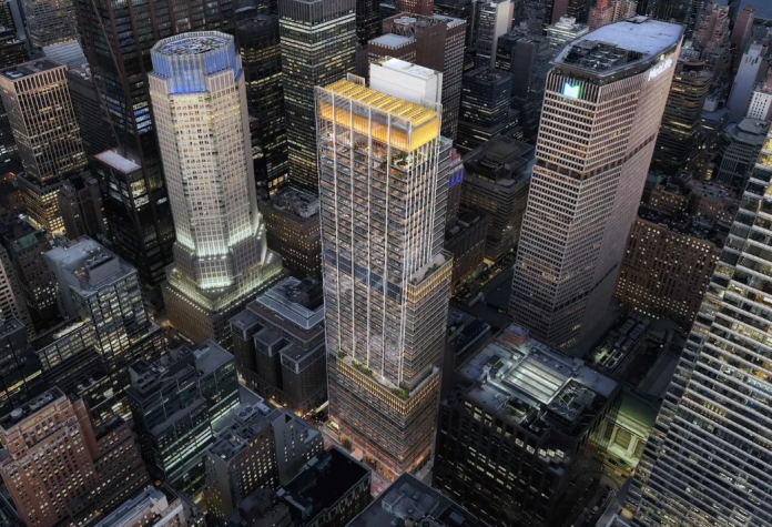 The high-rise, located between East 44th and 45th Streets in Midtown Manhattan, is designed by Kohn Pedersen Fox and will include 40 floors of office space. Podium levels will offer up to 27,500 sq. ft. of leasable space, while typical high-rise floors will span approximately 21,500 sq. ft.