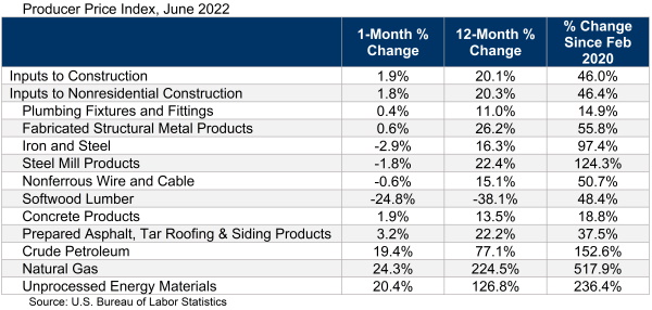 Construction input prices are up 20.1% from a year ago, while nonresidential construction input prices are 20.3% higher. On a monthly basis, input prices were down in four of 11 subcategories in June, with the largest decline registered in the softwood lumber category (-24.8%). All three energy subcategories experienced price increases, with natural gas prices rising 24.3% for the month.