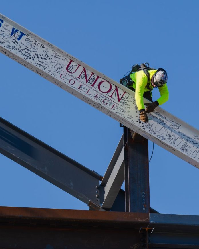 The final steel beam has been placed atop the Engineering and Computer Science Initiative (ECSI) building at Union College in Schenectady, featuring signatures from students, faculty and staff in a tradition that celebrates the collaboration behind the project’s construction.