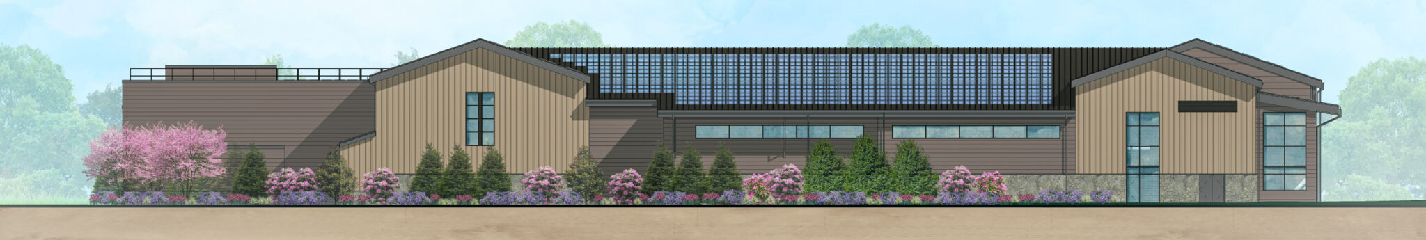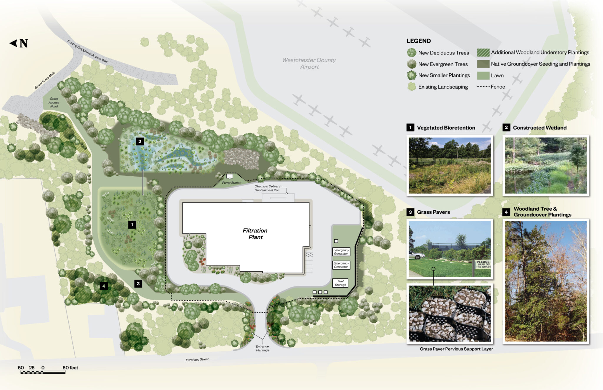 The facility will be located adjacent to Westchester County Airport, with a minimum 100-foot forest buffer and architectural design elements to mitigate visual impact. The site plan includes screening features, landscape plantings, bioswales, and preservation of a historic stone wall along Purchase Street. Sound-dampening measures will also be incorporated to minimize noise.