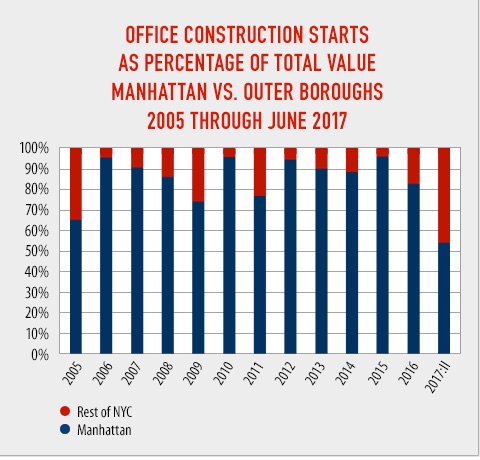 In what could be a sign of even further momentum outside of Manhattan’s traditional office center, the other four boroughs accounted for 46 percent of all office construction starts by value in the first half of 2017, compared to just 17 percent in all of 2016 and less than four percent overall in 2015, according to Dodge Data and Analytics.